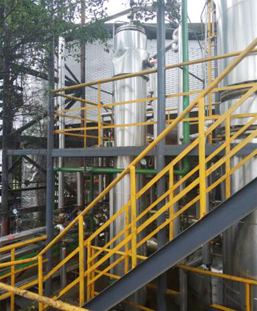 母液從進料口,通過真空負壓進入蒸發器上端,經過分液裝置讓液體形成薄膜從上而下,此時,夾套蒸汽對物料加熱,冷凝水從底部排出,薄膜液體在高真空下10至20秒內就汽化,汽化出來的汽體進入氣液傳質系統,在低壓降的高真空傳質系統內傳質交換,高沸液相回流到蒸發系統重新蒸發或排放;汽相部分一部分回流,另一部分從塔頂采出進入成品罐;塔釜高沸母液定期排出。該系統可以進行連續精餾,也可以進行間歇精餾,視產品質量和產量要求而定。系統高真空設計及安裝是本系統關鍵,要保證蒸發室內達到高真空對系統部件(填料-蘇爾壽)選擇及匹配很重要。